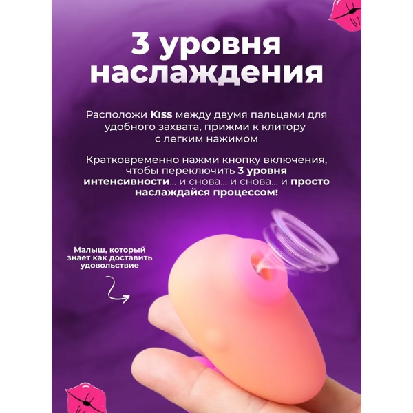Оригинальный и эргономичный дизайн устройства создан для комфорта и удобства. Расположите Kiss между двумя пальцами и плотно прижмите игрушку к коже. Такой удобный захват гарантирует полный контроль действий и ощущений.