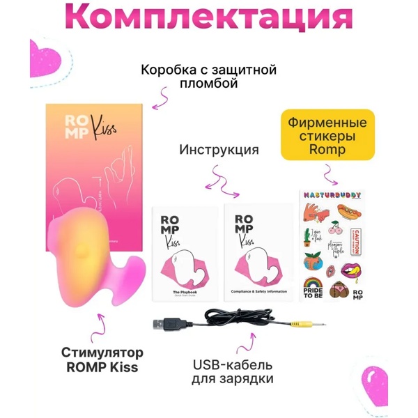 Romp Kiss, штекерный USB-кабель для зарядки, инструкция по эксплуатации, набор стикеров.