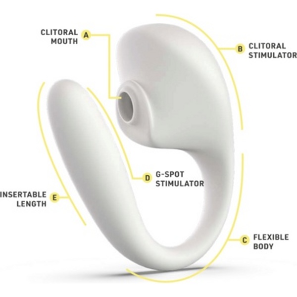 Клиторальная часть Ose 2 стимулирует и головку, и тело клитора, благодаря инновационной "подушечке" анатомичной формы, которая ложится между половых губ на вульву. Вакуумный стимулятор разработан по новой технологии: в нем не 1, а 2 мембраны, которые только выталкивают воздух на клитор, а не всасывают его - это делает стимуляцию одновременно более мощной и деликатной, чем у других девайсов. Вагинальная часть Ose 2 имитирует "манящие" движения пальца и стимулирует весь клито-уретро-вагинальный (КУВ) комплекс (более знакомое название - точка G). Гибкая и прочная конструкция девайса позволяет его использовать полностью без рук.