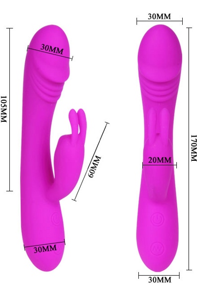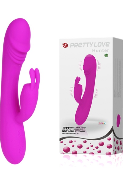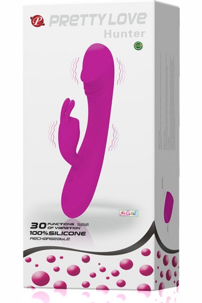 HUNTER - Вибромассажер с клиторальным стимулятором, кончик которого сделан в виде кролика с ушками, на которые передаются вибрации. Имеет 2 мотора и 2 точки для индукции мультискоростной вибрации. Идеально использовать для тренировки и массажа мышц влагалища, т.к. можно порождать вибрацию при обхвате мышцами различных зон массажера, тем самым напрягая разные зоны влагалищных мышц. Занятия с массажером позволят научиться попеременно сокращать различные участки мышц влагалища, доставляя себе и партнеру максимум удовольствия во время близости. Сделан из гладкого, шелковистого материала, очень приятного на ощупь. Влагостойкий, перезаряжаемый массажер имеет 30 режимов вибрации. Упакован в двойную упаковку, Внешняя красочная коробка с рисунками и обозначениями, внутри плотный бокс черного цвета без опознавательных картинок.