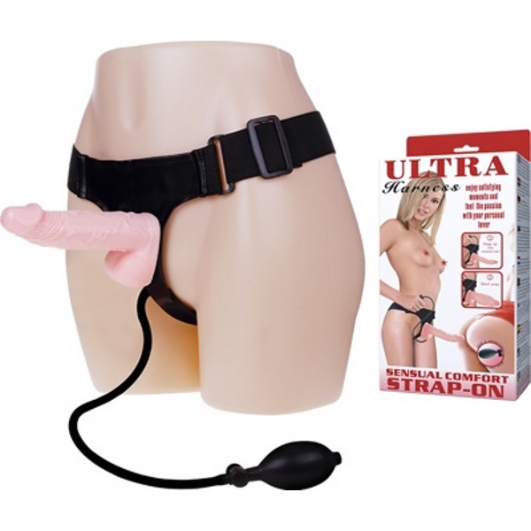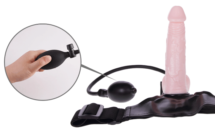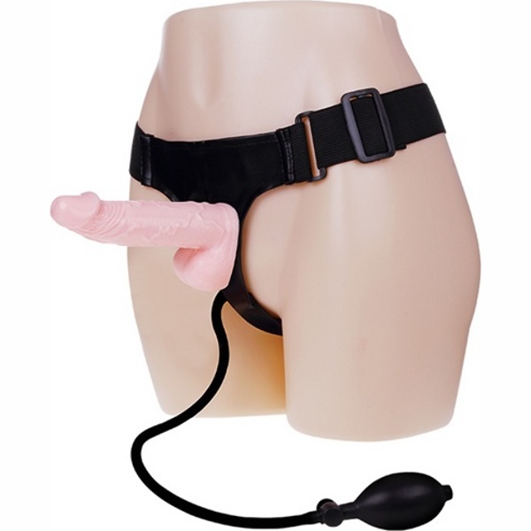 Этот страпон «Inflatable Strap-On» – прекрасный инструмент доминирования во время секса. Всё что нужно сделать, это закрепить на бедрах фаллос со вздернутой вверх головкой и аппетитными яичками. Помогут в этом эластичные ремешки на трусиках. Благодаря надежной фиксации, проникновение будет комфортным и точным. Из-за загнутой головки фаллос во время чувственных движений воздействует на точку G в вагине партнерши или простату в анусе партнера. Для тех, кто любит сильнее, больше и вообще «погорячее», предусмотрена груша-расширитель: нескольких нажатий будет достаточно, чтобы фаллос увеличился в размерах.