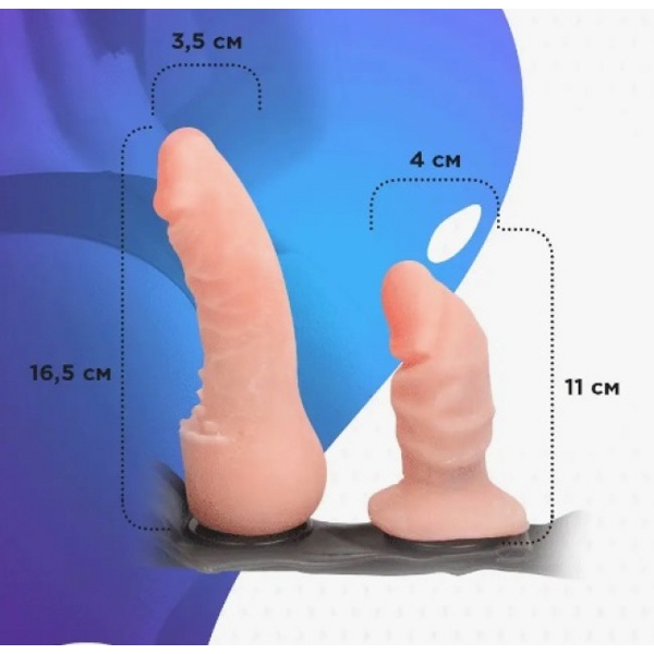 Размеры: длина большей насадки 16,5 см., диаметр 3,5 см, длина меньшей насадки 11 см, диаметр 4 см, трусики универсальный размер