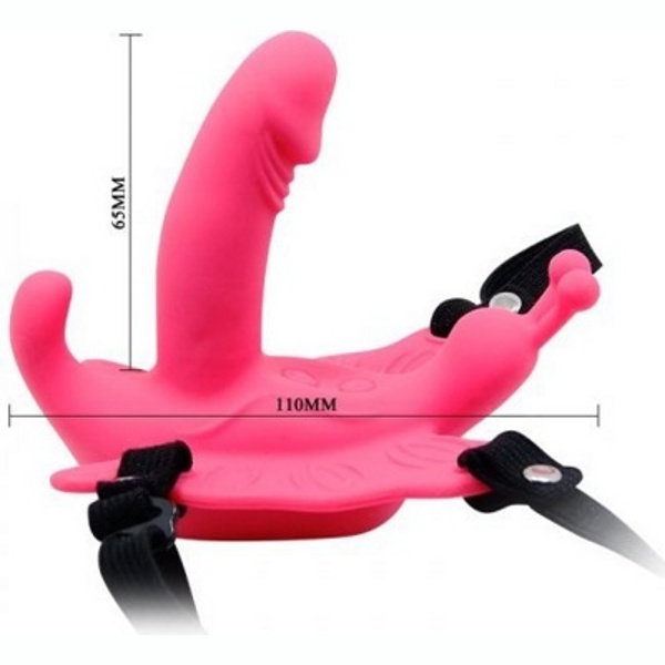 Бабочка имеет изогнутый вагинальный отросток, который простимулирует точку G, а усики бабочки подарят двойное удовольствие, лаская чувствительный клитор разнообразнейшими 10 функциями вибрации. Носить бабочку очень просто, одевается она на бедра с помощью регулируемых эластичных ремешков.