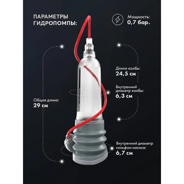 В отличие от других вакуумных помп гидропомпы Bathmate использует силу воды, поэтому его нужно использовать в ванной или душе.