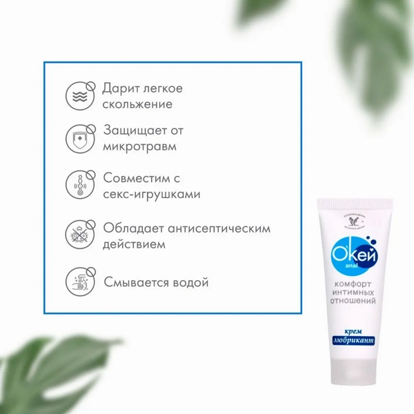 Приятно разнообразить сексуальную жизнь поможет мягкий водно-силиконовый крем «О'кей Anal». Отлично подходит парам, практикующим анальный секс. Обеспечивает нежное, устойчивое и длительное скольжение. Обладает антисептическим действием, защищает от инфицирования. Смывается водой. Может использоваться с секс-игрушками.