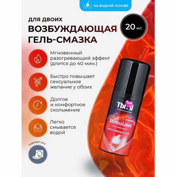 Гель-любрикант усиленного действия «StimuLove Strong» из коллекции «Ты и Я» предназначен для искушенных и активных ценителей острых ощущений. Обладает мгновенным разогревающим эффектом длительностью до 40 минут, прекрасно стимулирует сексуальное возбуждение у обоих партнеров и обеспечивает продолжительное скольжение на протяжении всего полового контакта. Любрикант можно применять с презервативами и секс-игрушками из любых материалов, он не оставляет следов на одежде и легко смывается обычной проточной водой.