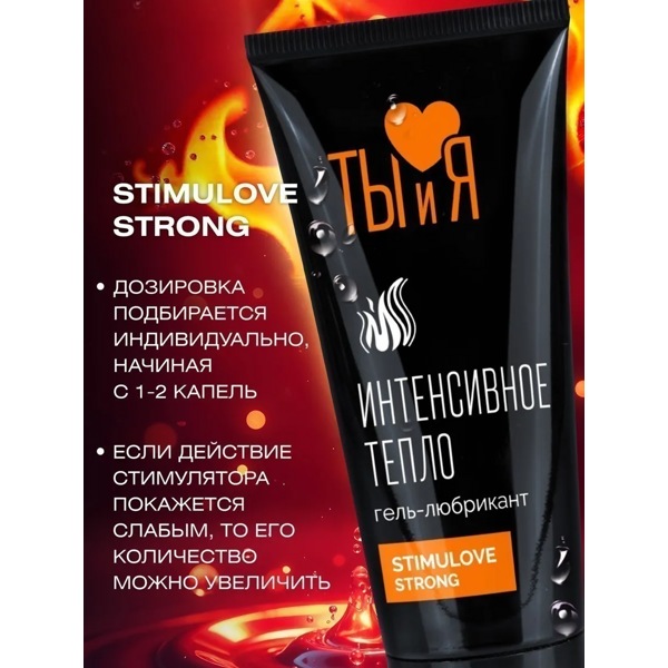 Гель-любрикант усиленного действия StimuLove Strong из коллекции «Ты и Я» предназначен для искушенных и активных ценителей острых ощущений. Обладает мгновенным разогревающим эффектом длительностью до 40 минут, прекрасно стимулирует сексуальное возбуждение у обоих партнеров и обеспечивает продолжительное скольжение на протяжении всего полового контакта. Любрикант можно применять с презервативами и секс-игрушками из любых материалов, он не оставляет следов на одежде и легко смывается обычной проточной водой.