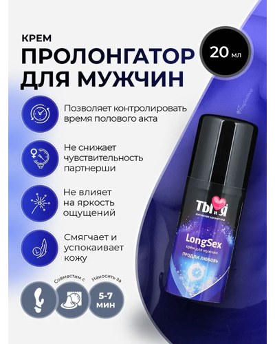 «LongSex» – крем для мужчин. Прежнее название – крем М1. Стоп-крем быстрого действия. Активно впитывается. Ухаживает за кожей полового члена, оказывает смягчающее и успокаивающее действие. На яркость ощущений, эрекцию и потенцию не влияет. Эффект наступает через 5-7 минут после нанесения. Совместим с презервативами, изделиями из латекса и синтетических материалов и любыми средствами секс-косметики.