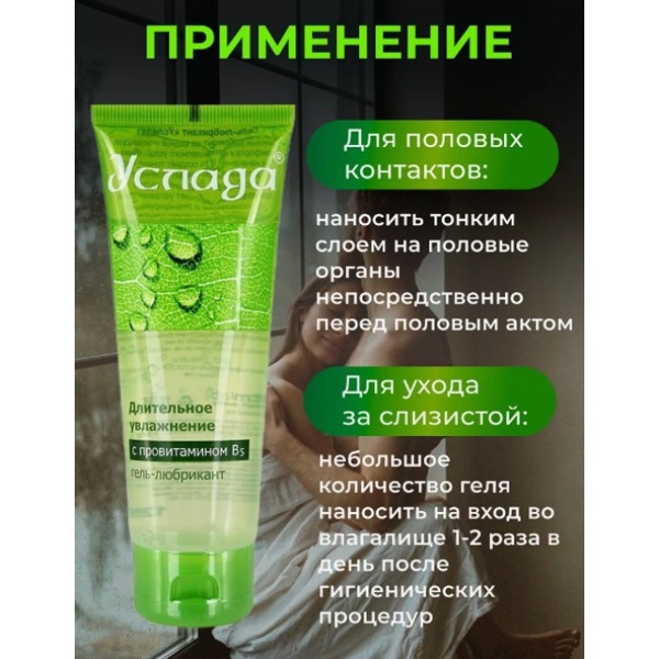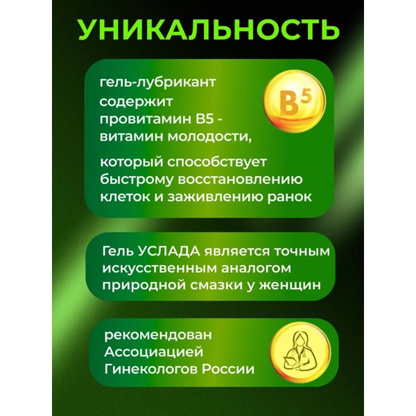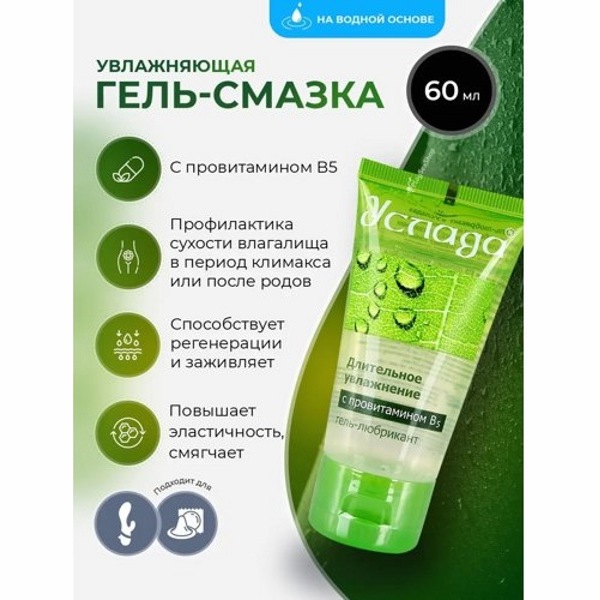 «Услада» - безжировая водная смазка без цвета, запаха и с нейтральным вкусом. На основе водорастворимой целлюлозы. Великолепно имитирует естественную смазку, обладает повышенным увлажняющим действием и усиленным ранозаживляющим эффектом. Применяется при недостаточной естественной секреции или при интенсивной половой жизни для исключения болевых ощущений, повышения комфортности любовного акта, предотвращения появления микротравм, потертостей и трещин - очагов развития инфекций.