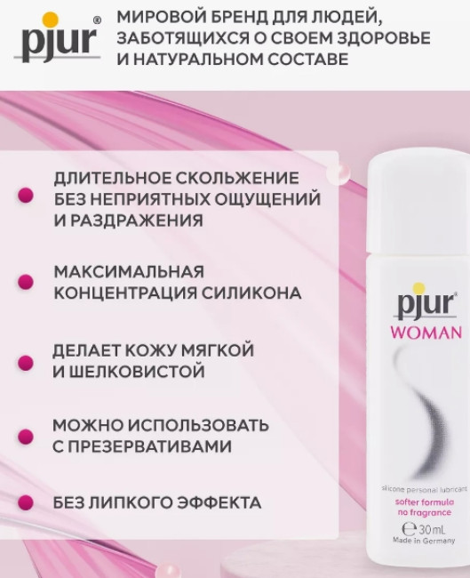 Концентрированный лубрикант PJUR WOMAN на силиконовой основе, специально разработан для нежной и чувствительной кожи женщин. Лубрикант идеально подходит для массажа тела и для интимного применения. Кожа остается мягкой и шелковистой, без ощущения липкости. В составе нет масел, жира, воды. Не имеет защитных свойств, не содержит спермицидов. Безопасен для использования с интимными игрушками и презервативом. Нанесите несколько капель лубриканта для массажа на тело или на половые органы непосредственно перед половым контактом.