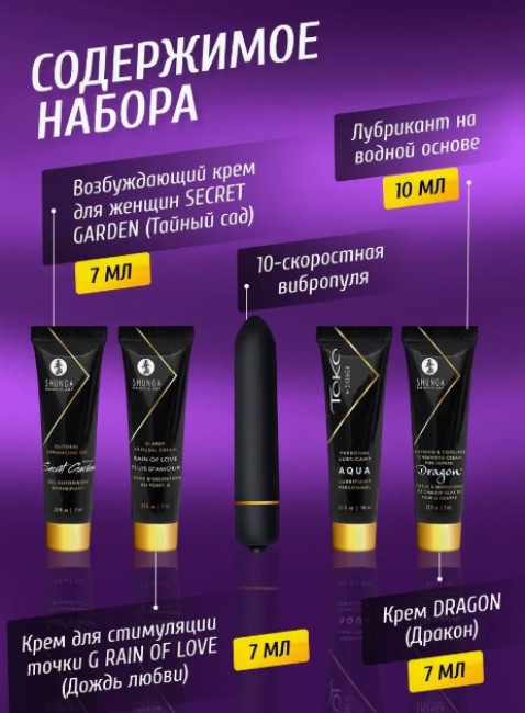 В состав входят лучшие продукты марки: водный лубрикант, возбуждающий крем и стимулирующий гель.