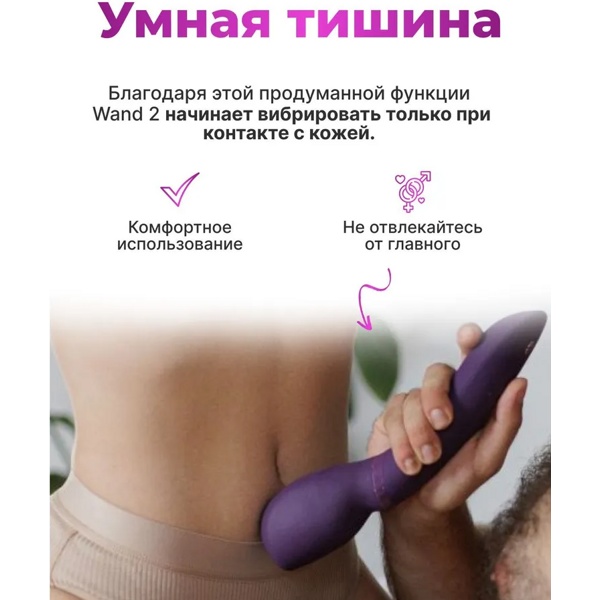 Еще одна уникальная функция Wand 2 — это Smart Silence, которая включает вибрацию только при соприкосновении с кожей и делает использование устройства еще комфортнее. При желании Smart Silence можно отключить, для этого на корпусе массажера есть отдельная кнопка.