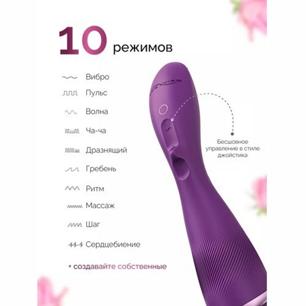 Уровни интенсивности работы вы можете регулировать одним касанием. Вибрация регулируется плавно: с каждым прикосновением сила вибрации увеличивается на 1 уровень. 10 режимов вибрации, 24 уровня интенсивности, создание уникальных вибраций и вибрация в такт музыке через приложение.