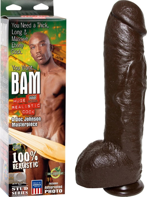 Фаллоимитатор BAM от Doc Johnson - большой черный на присоске, сделан на основе слепка с пениса известного чернокожего актера. Большой размер подойдет для любителей сильных ощущений, фистинга. Дилдо выполнен из PVC и позволяет использовать смазки на любой основе.