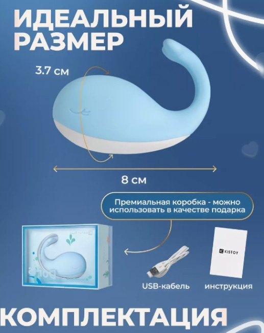 Вибратор Kisstoy Doris - это мощное виброяйцо с дистанционным управлением в форме симпатичного голубого кита. Виброяйцо погружается во влагалище и всесторонне стимулирует внутренние мышцы, а внешний хвост даёт еще больше приятных ощущений, воздействуя на зону вокруг клитора. В отличие от вибраторов, такими игрушками не получится двигать в процессе. Руки оказываются свободны, а управление игрушкой можно осуществлять с помощью пульта или отдать пульт партнёру. Пульт работает на расстоянии до 12 метров, что дает большие возможности для экспериментов.