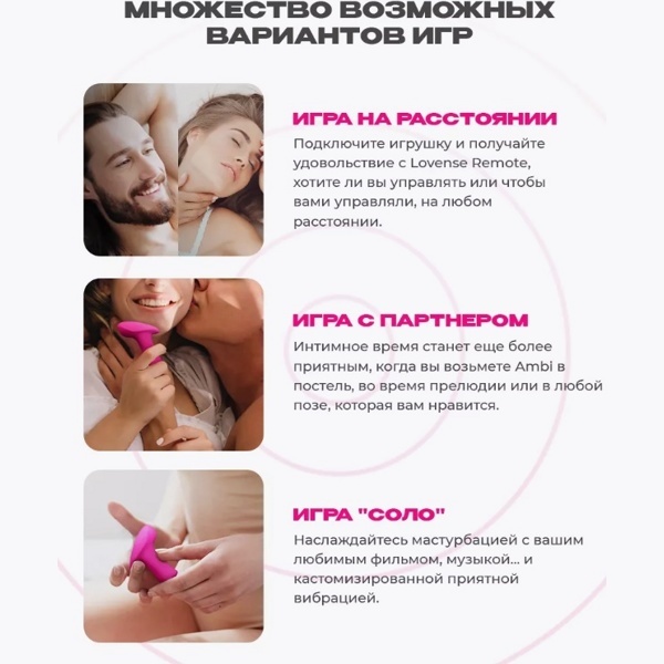 Клиторальный вибратор Lovense Ambi оснащен мощным моторчиком, который распространяет сильные вибрации по всему участку стимулирующей зоны. Игрушка оснащена 3 интенсивностями и 10 режимами вибраций, среди которых Вы точно найдете ту самую, которая заставит Вас биться в экстазе удовольствия.