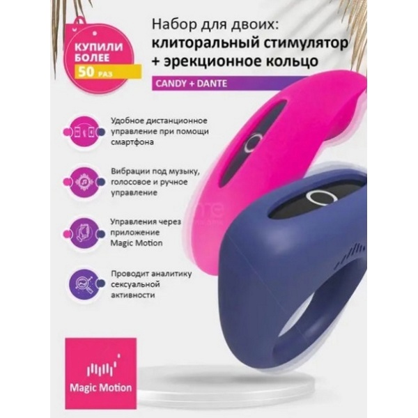 Комплект Magic Motion Candy + Dante от Magic Motion включает в себя две потрясающие смарт игрушки: эрекционное виброкольцо для Него и клиторальный стимулятор для Нее.