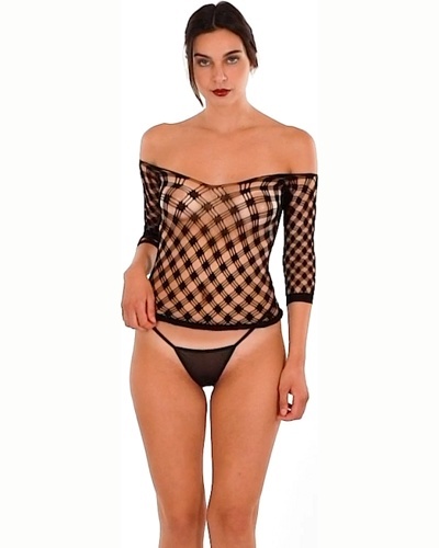 Эротическое черное мини-платье в сеточку с длинными рукавами «Penthouse Passion Goddess» акцентирует внимание на открытых плечах. Рисунок повторяется по всему телу, создавая чувственный контраст между кожей и светом.
