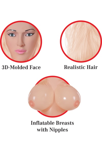 Надувная секс кукла имеет два рабочих отверстия: анальное и вагинальное. Они реалистичные и мягкие, это сделает ощущения максимально естественными! Ее большая объемная грудь поразит своей пышной формой 4 размера. Ручки немного согнуты в локтях, что бы приобнять Вас. Ладошки — в виде варежек, без маникюра.
