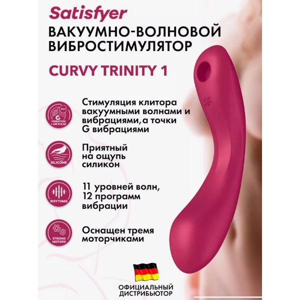 Вакуумный стимулятор клитора с вибрирующей ручкой Satisfyer Curvy Trinity 1 - это уникальный продукт, который включает в себя функции бесконтактного клиторального массажера, а также вибратора для точки G.