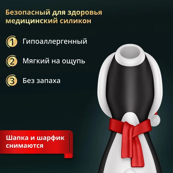 Satisfyer Penguin Holiday Edition - Вакуумно-волновой бесконтактный стимулятор клитора – самый популярный продукт от Satisfyer! Эта лимитированная игрушка была специально разработана для новогодних праздников и незабываемого “джингл белс”. Вакуум-волновая стимуляция клитора – это лучшее, что могло случиться с женским оргазмом! Идеальный питомец в качестве первой игрушки, вызывает умиление, до тех пор, пока не пустить его в дело. С помощью вакуумно-волновой стимуляции клитора Satisfyer Pro Penguin Holiday Edition обеспечивает невероятные ощущения и многократные интенсивные оргазмы без прямого контакта с клитором. Его мягкий силиконовый носик лишь слегка касается области вокруг клитора, создавая взрывную волну наслаждения. Этот стильный и оригинальный стимулятор поставляется вместе с очаровательным шарфиком и милой шапочкой Санты, которые можно снять или надеть на игрушку по вашему желанию. Все аксессуары, как и стимулятор, изготовлены из мягкого медицинского силикона и легко снимаются и надеваются на пингвина. Праздничная упаковка с защитой от вскрытия прекрасно подходит в качестве подарка не только возлюбленной, но и лучшей подружке. Познала счастье - поделись с подругой.