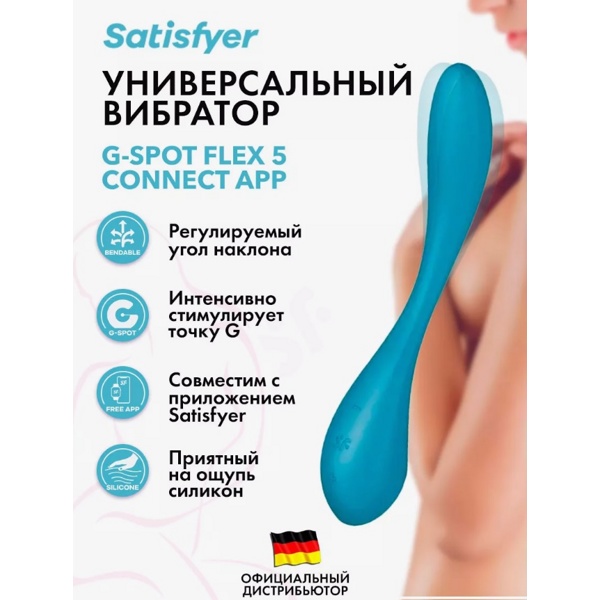 Satisfyer G-Spot Flex 5 — это не обычный вибратор — он удивительно гибкий и адаптируется к изгибам вашего тела. Больше никаких неудобных положений вибратора, чтобы стимулировать нужные места. Найдите удобное для вас положение, возьмите G-Spot Flex 5 в руку и наслаждайтесь прикосновением к гладкому шелковистому силикону. Вибратор имеет 12 режимов вибрации и 2 мощных мотора - все для того, чтобы Вы получили самое яркое наслаждение! Мощные и глубокие вибрации распределяются равномерно по всей поверхности игрушки, интенсивно воздействуя на точку G. Попробуйте все варианты вибрации и выберите для себя "тот самый". Силиконовый вибратор G-Spot Flex 5 имеет встроенный литий-ионный аккумулятор. Магнитный кабель для зарядки входит в комплект. Вибростимулятор G-Spot Flex 5 водонепроницаем и изготовлен из гладкого силикона, который прекрасно скользит по коже. Кроме того, материал за короткое время нагревается до температуры тела. Синхронизируется с вашим телефон, через приложение- Satisfyer Connect! Функция интеграции устройств позволяет вам дополнительно расширить свой репертуар удовольствия - вы можете использовать до 4 игрушек одновременно. Комплектация: вибратор, USB-кабель, инструкция на русском языке. Рекомендации к применению: перед первым применением и после использования помыть тёплым мыльным раствором и/или обработать очистителем для секс игрушек. Во избежание микротравм и для более комфортного применения, пользуйтесь смазками и лубрикантами. Внимание! Чтобы избежать преждевременного разрушения материала и для более продолжительного срока службы вибро-стимулятора, используйте лубриканты и смазки только на водной основе!