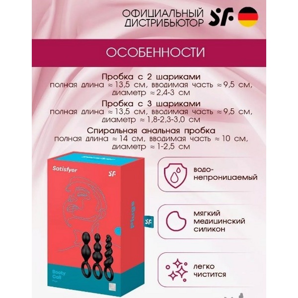 Одна, две или три? Если твоему заднему проходу нравится испытывать чувственные перемены и игры с массажем, то это щекотливое трио станет идеальным компаньоном в анальных играх. Эластичные пробки из медицинского силикона Satisfyer Booty Call побалуют твою попку ласкающей поверхностью софт-тач и благодаря своему узкому кончику и гладкому, особо нежному качеству они подходят для новичков и первооткрывателей. У тебя есть на выбор соблазнительно скрученный спиралью дизайн, тонкая конусная форма и классическая структура в виде увеличивающихся шариков. При этом комплект симпатичных расцветок предлагает буйство ощущений, как для страстного соло, так и для сладостных забав с партнером. Открой для себя этот волнующий набор различных расширяющихся форм и заодно потренируй свой задний проход таким особо пикантным способом. Возбуждающее движение туда и обратно заставит наслаждаться каждым его сантиметром, и в то же время влажное скольжение обеспечит незабываемую стимуляцию. Если ты используешь этого эластичного соблазнителя в качестве пробки, то при каждом движении тебя будут ласкать различные по форме структуры, а ручки то свободны – какие игры ты сможешь сейчас начать, подскажет только твоя фантазия!