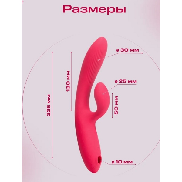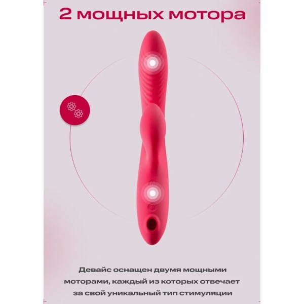 Каждая часть игрушки функциональна: вагинальный и клиторальный отростки обеспечивают двойную стимуляцию чувствительных зон, а в ручке вибратора расположен вакуумный стимулятор клитора.