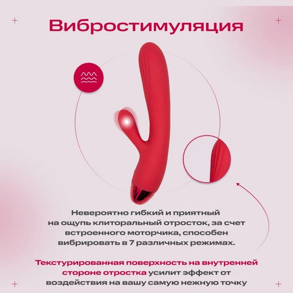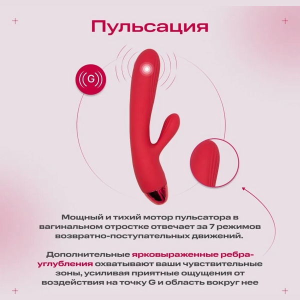 Нажмите на кнопку для смены режима вибрации и пульсации, всего режимов 7. В вагинальном отростке находится мотор пульсатора, в клиторальном – вибромотор.