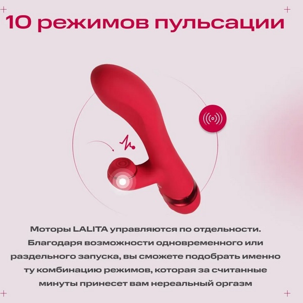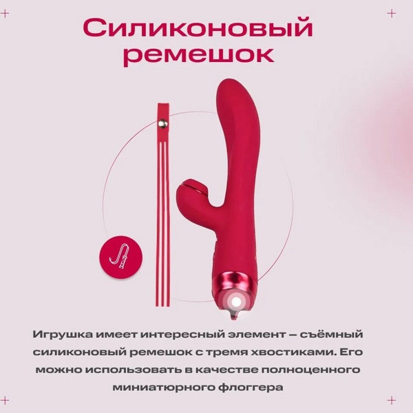 Вибратор кролик Woma Lalita с таппингпульсацией, красный. Клиторальный стимулятор воздействует на вашу самую нежную интимную зону пульсацией (осцилляцией) и имеет 10 режимов стимуляции. Игрушка так же имеет 10 режимов вибрации. Каждая из функций управляется по отдельности. Этот стимулятор точно не даст вам заскучать! Игрушка покрыта гладким, приятным на ощупь, безопасным, медицинским силиконом. Так что проникновения будут приятными и не травмирующими. Женский вибратор имеет длинный тройной ремешок из силикона - это изюминка вибратора, как элемент дизайна. Его можно, например, использовать в парной игре в качестве порки - пикантная прелюдия перед жарким соитием. Таппинг стимулятор имеет водонепроницаемость IPx6, так что смело берите его с собой в душ, главное - не погружайте его полностью под воду. Эта интим игрушка привнесет много новых эмоций в вашу сексуальную жизнь и точно не оставит вас равнодушными!