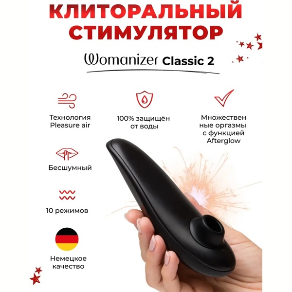 Womanizer Classic 2 — это обновленная версия любимого всеми компактного стимулятора Classic. Уникальная технология Pleasure Air™ мягко воздействует на клитор воздушными волнами без прямого контакта с ним. 10 уровней стимуляции позволяют выбрать тот, который понравится именно вам. Просто расслабьтесь и наслаждайтесь.