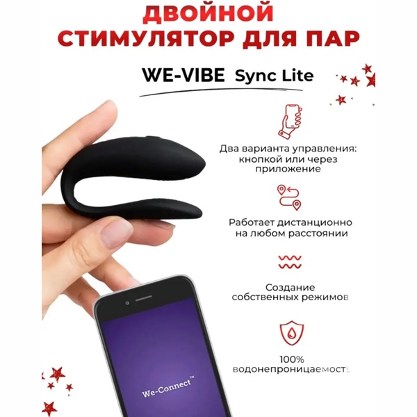 We-Vibe Sync Lite — это отличный вибратор для пар, которые хотят разнообразить свою сексуальную жизнь. Его можно использовать во время секса для стимуляции обоих партнеров: меньший отросток вводится вагинально, в то время как больший ложится на клитор. Таким образом, руки остаются свободными, чтобы ласкать партнера. Игрушка имеет 10 предустановленных режимов вибрации, которыми легко управлять с помощью кнопки на корпусе. Но если вам захочется большего, всегда можно установить бесплатное приложение We-Vibe App и значительно расширить возможности игрушки.